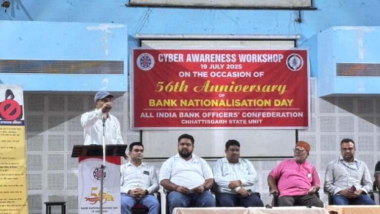 रायपुर। आज 19 जुलाई 2025 को बैंकों की राष्ट्रीयकरण के 56 वे वर्षगाँठ के अवसर पर आल इंडिया बैंक ऑफिसर्स...