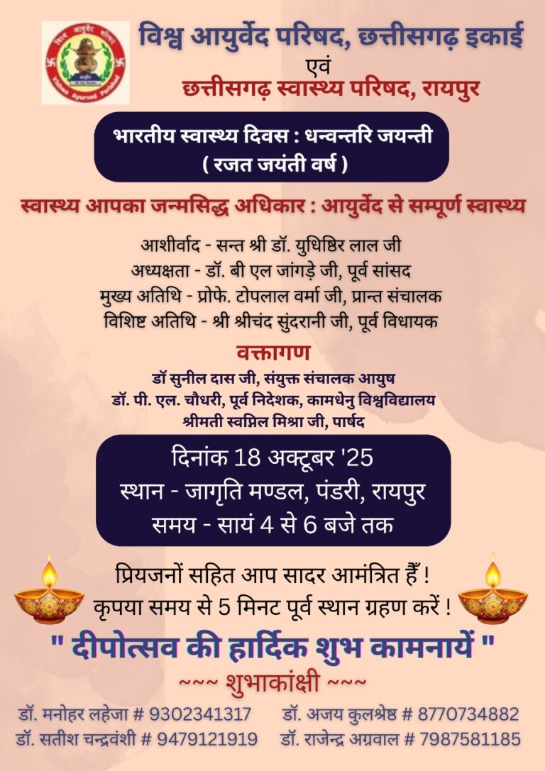 रायपुर। धन्वन्तरि जयंती के पावन अवसर पर विश्व आयुर्वेद परिषद, रायपुर इकाई के तत्वावधान में एक विशेष विचार गोष्ठी एवं...