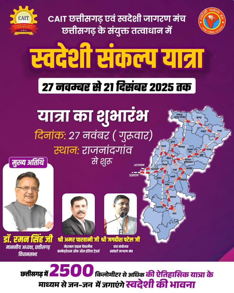 राजनांदगांव। कन्फेडरेशन ऑफ ऑल इंडिया ट्रेडर्स (CAIT) एवं स्वदेशी जागरण मंच के संयुक्त तत्वावधान में पूरे देश में संचालित स्वदेशी संकल्प...