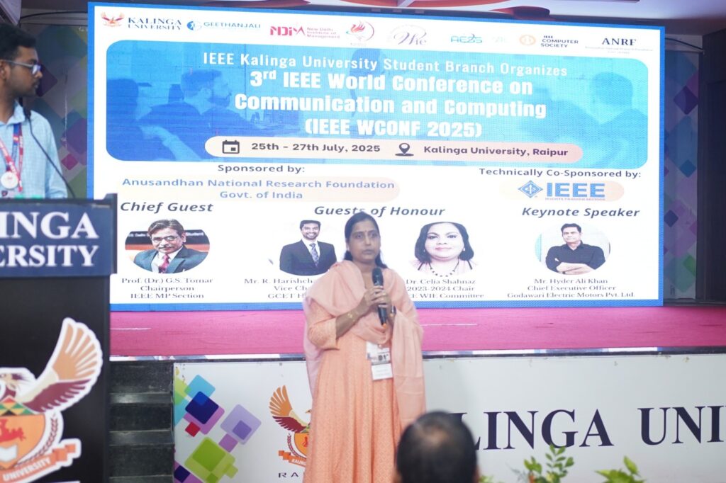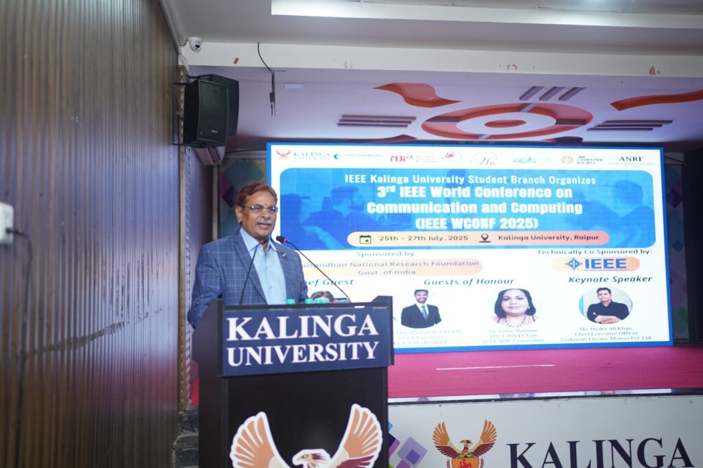 रायपुर। कलिंगा विश्वविद्यालय की IEEE छात्र शाखा ने हैदराबाद स्थित गीतांजलि कॉलेज ऑफ इंजीनियरिंग एंड टेक्नोलॉजी (GCET) एवं नई दिल्ली स्थित न्यू दिल्ली इंस्टीट्यूट ऑफ मैनेजमेंट (NDIM) के सहयोग से तीसरा अंतरराष्ट्रीय वर्ल्ड कॉन्फ्रेंस ऑन कम्युनिकेशन एंड कंप्यूटिंग 2025 का आयोजन 25 से 27 जुलाई 2025 के बीच सफलतापूर्वक किया। यह सम्मेलन भारत सरकार के अनुसंधान राष्ट्रीय अनुसंधान प्रतिष्ठान (ANRF) द्वारा प्रायोजित तथा IEEE मध्यप्रदेश सेक्शन द्वारा तकनीकी रूप से सह-प्रायोजित रहा।