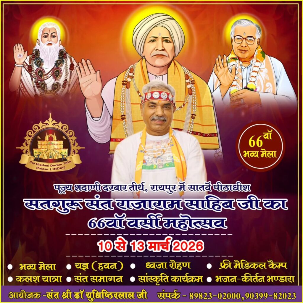 रायपुर। अंतरराष्ट्रीय मानवता की सेवा और भारतीय सनातन संस्कृति के प्रतीक 317 वर्ष प्राचीन आस्था केंद्र पूज्य शदाणी दरबार तीर्थ, रायपुर में प्रकांड विद्वान और करुणा के सागर परम पूज्य सतगुरु संत राजाराम साहब जी का 66वां वर्सी महोत्सव 10 से 13 मार्च 2026 तक श्रद्धा और भक्ति के साथ मनाया जाएगा। इस अवसर पर देश ही नहीं, बल्कि विदेशों से भी बड़ी संख्या में श्रद्धालु शामिल होने रायपुर पहुंच रहे हैं।