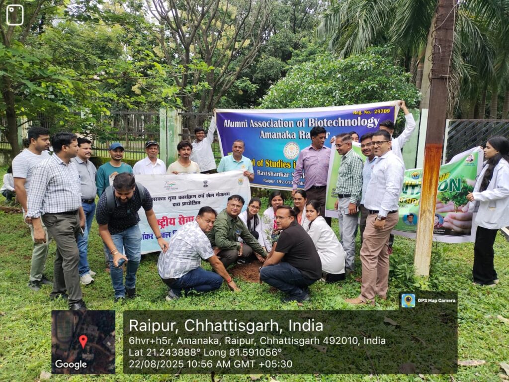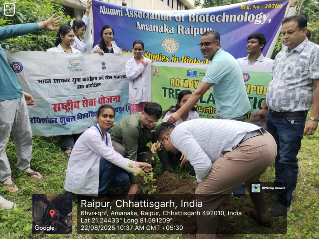 रायपुर। पं. रविशंकर शुक्ल विश्वविद्यालय परिसर में 22 अगस्त 2025 को राष्ट्रीय सेवा योजना (एन.एस.एस.), रोटरी क्लब रायपुर तथा बायोटेक्नोलॉजी विभाग के संयुक्त तत्वावधान में पौधारोपण कार्यक्रम का आयोजन किया गया।