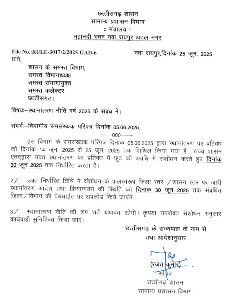 रायपुर। छत्तीसगढ़ शासन ने कर्मचारियों को बड़ी राहत देते हुए 30 जून तक स्थानांतरण आदेश जिला-विभागीय वेबसाइट पर अपलोड करने की छूट दी है. इसके पहले यह छूट केवल 25 जून तक थी. सामान्य प्रशासन विभाग की ओर से तमाम विभागाध्यक्षों को स्थानांतरण नीति वर्ष 2025 के संबंध में जारी पत्र में बताया गया है कि स्थानांतरण पर प्रतिबंध को 25 जून तक शिथिल किया गया है.