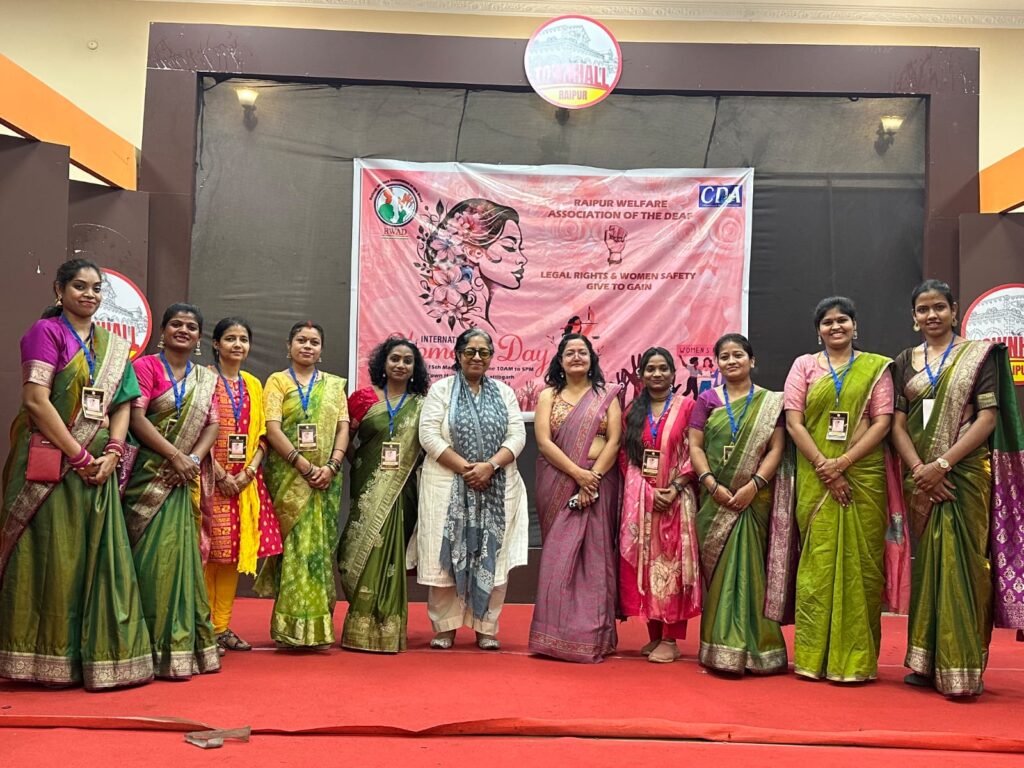रायपुर। रायपुर वेलफेयर एसोसिएशन ऑफ द डेफ (RWAD) की ओर से 15 मार्च 2026 को कलेक्टोरेट स्थित टाउन हॉल में “बधिर महिलाओं का अंतर्राष्ट्रीय महिला दिवस जागरूकता कार्यक्रम” आयोजित किया गया। कार्यक्रम का विषय “कानूनी अधिकार एवं महिला सुरक्षा जागरूकता – Give to Gain” रखा गया।