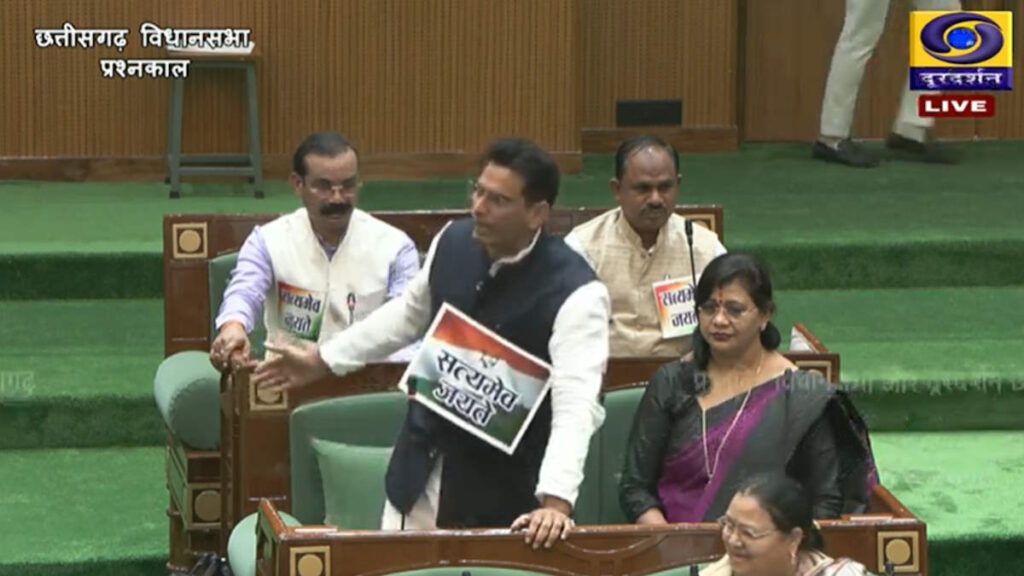 छत्तीसगढ़ विधानसभा : हंगामे के साथ शुरू हुआ चौथे दिन का सत्र, कांग्रेस विधायकों ने सीने पर लगाए पोस्टर…