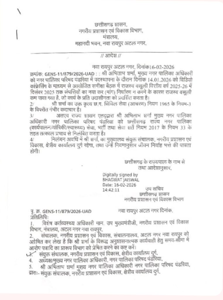 आदेश में उल्लेख किया गया है कि उक्त कृत्य छत्तीसगढ़ सिविल सेवा (आचरण) नियम, 1965 के नियम-3 के विपरीत है। इसके तहत छत्तीसगढ़ राज्य नगर पालिका (कार्यपालन/यांत्रिकी/स्वास्थ्य) सेवा भर्ती एवं सेवा शर्तें नियम, 2017 के नियम-33 के अंतर्गत अभिताभ शर्मा को निलंबित किया गया है।