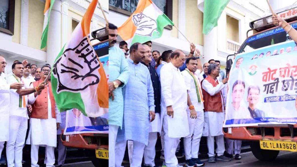 रायपुर। वोट चोर गद्दी छोड़ अभियान के तहत कांग्रेस ने छत्तीसगढ़ में हस्ताक्षर अभियान चलाया. प्रदेशभर से करीब साढ़े 15 लाख से अधिक हस्ताक्षर फॉर्म एकत्र हुआ है, जिसे दिल्ली भेजा गया. पीसीसी चीफ दीपक बैज, नेता प्रतिपक्ष चरण दास महंत ने वाहन को हरी झंडी दिखाकर सभी हस्ताक्षर फाॅर्मों को दिल्ली के लिए रवाना किया.