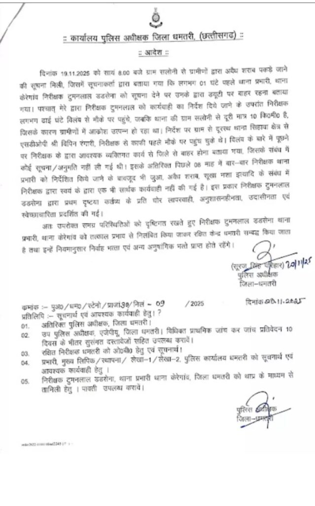 जानकारी के मुताबिक ये पूरा मामला धमतरी के केरगांव थाना क्षेत्र का मामला है। बताया जा रहा है कि 19 नवंबर को इस क्षेत्र के सलोनी गांव में ग्रामीणों ने अवैध शराब पकड़ी थी। जिसकी सूचना ग्रामीणों ने तत्काल थाना प्रभारी दुमनलाल डडसेना को दी गयी। लेकिन थानेदार ने काम से बाहर होने की बात कहकर तुरंत मौके पर आने में असमर्थता जता दी। जिसके बाद ग्रामीणों ने इसकी शिकायत एसपी सूरज सिंह से कर दी।