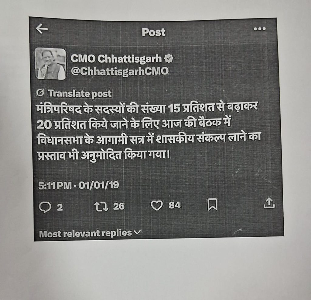 पूर्व सीएम भूपेश बघेल ने साय सरकार में 14 मंत्रियों की संख्या पर सवाल उठाते हुए कहा कि 2003 में बने कानून के मुताबिक विधानसभा सदस्यों की संख्या में 15% तक ही मंत्री बन सकते हैं। जब 2018 में कांग्रेस की सरकार बनी थी, तो मैंने भारत सरकार को पत्र लिखा था। छत्तीसगढ़ में मंत्रियों की संख्या 15 प्रतिशत से बढ़ाकर 20% तक करने की मांग की गई थी। इसके पीछे छत्तीसगढ़ का भौगोलिक रूप से बड़ा होना और विधानसभा परिषद न होने का तर्क दिया था। लेकिन पत्र का कोई जवाब नहीं आया और न ही अनुमति मिली। ऐसे में अब सवाल उठ रहा साय सरकार को अनुमति कब मिली ? बिना अनुमति अगर 14 मंत्री बनाए गए तो यह अवैधानिक है। मुख्यमंत्री साय को इसका जवाब देना चाहिए।
