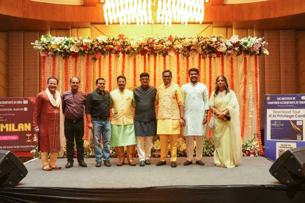 रायपुर। भारतीय चार्टर्ड अकाउंटेंट्स संस्थान (ICAI), रायपुर शाखा (CIRC) एवं आयकर बार एसोसिएशन, रायपुर के संयुक्त तत्वावधान में भव्य दीपावली मिलन समारोह का आयोजन किया गया, जिसमें दोनों संस्थाओं के सदस्य एवं उनके परिवारजन उत्साहपूर्वक सम्मिलित हुए। यह आयोजन उल्लास, आनंद एवं आत्मीयता से परिपूर्ण रहा।