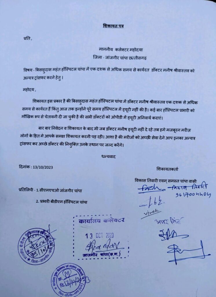 • शिकायतों का अंबार: बीडीएम अस्पताल चांपा में पदस्थापना के दौरान स्थानीय नागरिकों ने कलेक्टर से उनकी लिखित शिकायत की थी।