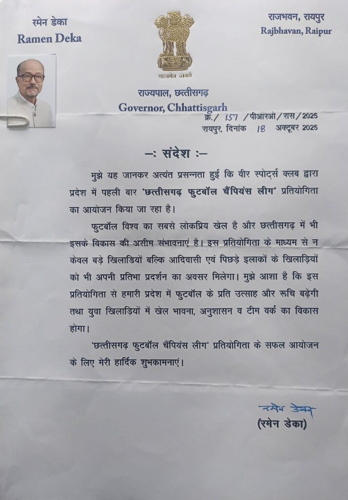 छत्तीसगढ़ फुटबॉल चैंपियंस लीग के चौथे राउंड में लायंस, जेएसएफ और पैंथर्स की जीत, राज्यपाल रमेन डेका ने दी शुभकामनाएं…