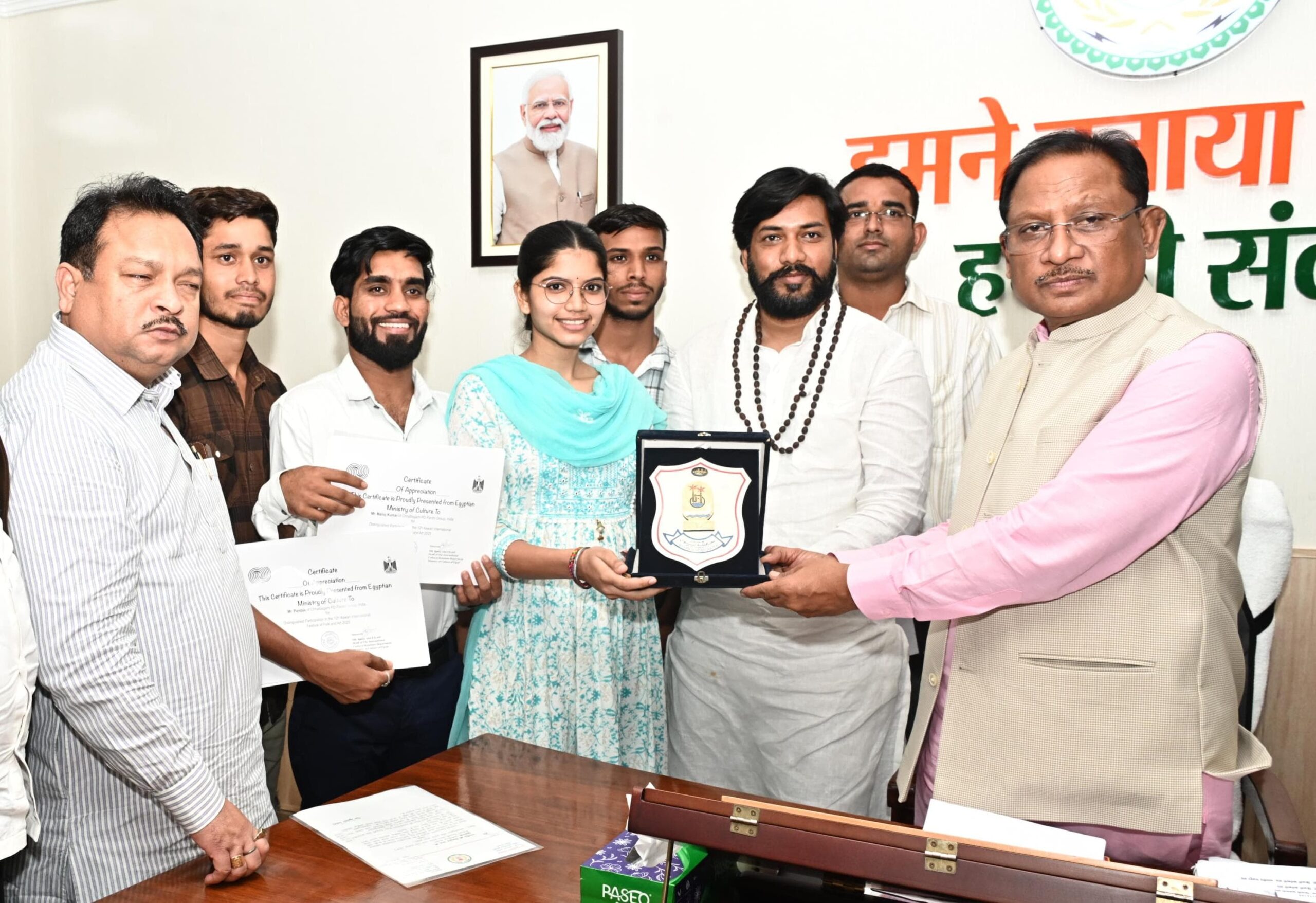 रायपुर।   मुख्यमंत्री विष्णुदेव साय से उनके निवास कार्यालय में पंथी नृत्य दल ने सौजन्य मुलाकात की। पंथी नृत्य दल के सदस्यों ने बताया कि वे 13 से 24 फरवरी 2025 तक मिस्र (इजिप्ट) में आयोजित अंतर्राष्ट्रीय सांस्कृतिक महोत्सव में भारत का प्रतिनिधित्व कर चुके है। मुख्यमंत्री श्री साय ने पंथी नृत्य दल के सभी कलाकारों को अपने कला-प्रदर्शन के माध्यम से विदेश की धरती पर छत्तीसगढ़ की माटी की सुगंध बिखेरने के लिए बधाई और शुभकामनाएं दीं। इस अवसर पर विधायक खुशवंत सिंह साहेब उपस्थित थे।