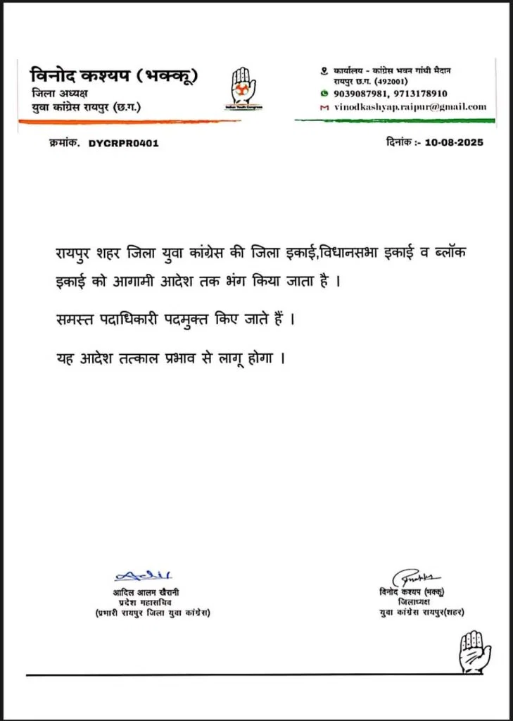रायपुर शहर जिला युवा कांग्रेस की कार्यकारिणी की गई भंग, आदेश जारी