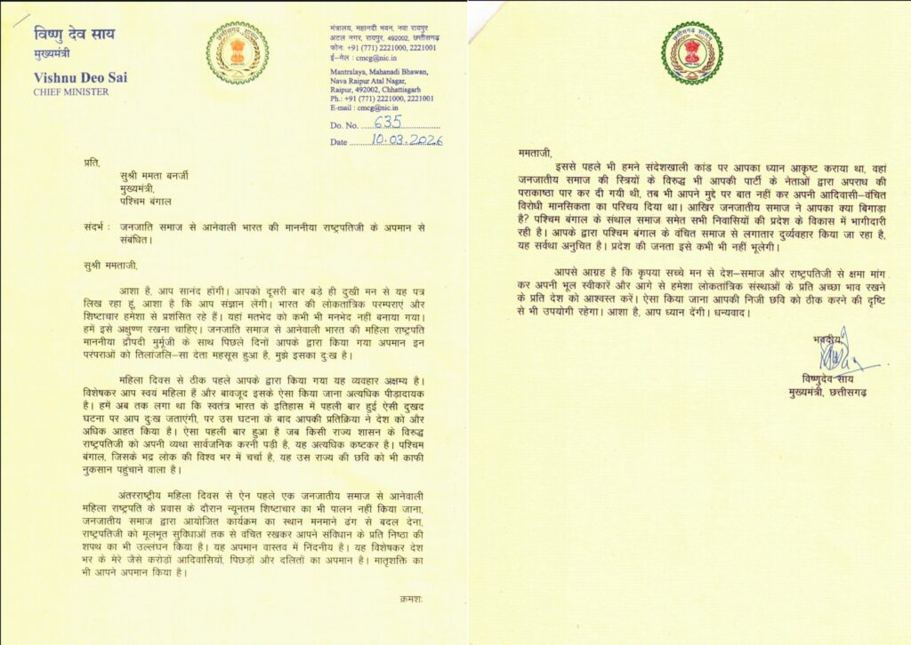 रायपुर। मुख्यमंत्री विष्णु देव साय ने पश्चिम बंगाल की मुख्यमंत्री ममता बनर्जी को कड़ा पत्र लिखकर भारत की माननीय राष्ट्रपति द्रौपदी मुर्मू के साथ हाल ही में हुए व्यवहार पर गहरी आपत्ति जताई है।
