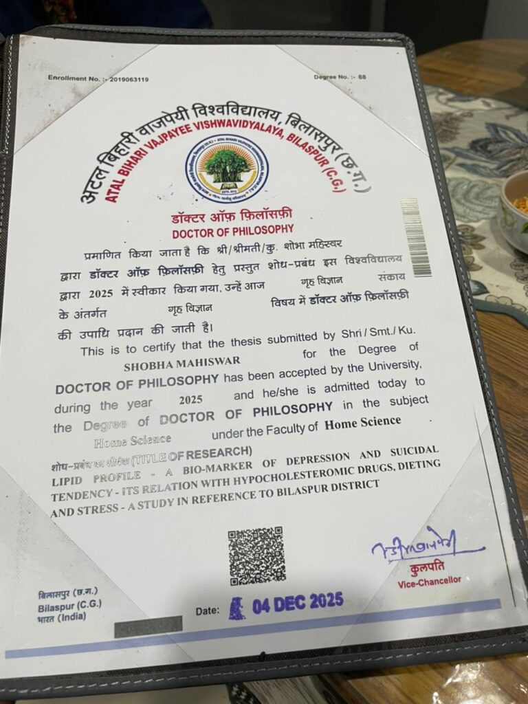 दीक्षांत समारोह में शोभा महेश्वर को आत्महत्या व तनाव विषय पर शोध के लिए गोल्ड मेडल और डॉक्टरेट की उपाधि से किया गया सम्मानित