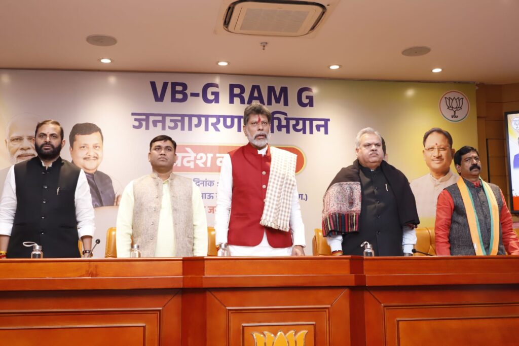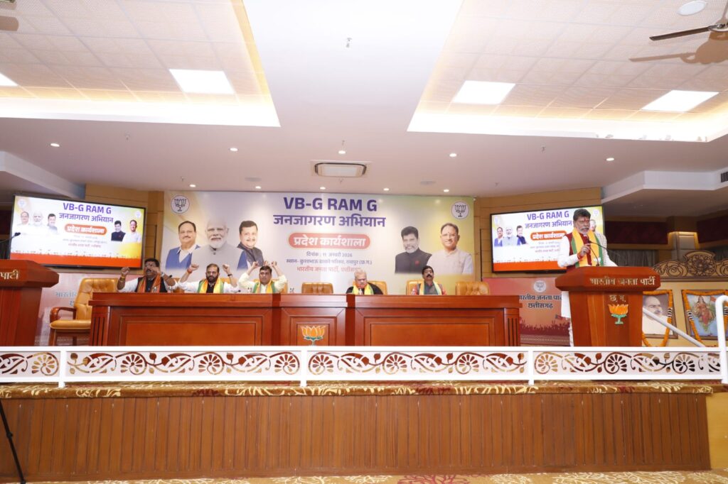रायपुर। भारतीय जनता पार्टी केप्रदेश कार्यालय में विकसित भारत जी-राम-जी जनजागरण अभियान को लेकर प्रदेशस्तरीय कार्यशाला आहूत की गई। राज्यसभा सांसद एवं भाजपा राष्ट्रीय महामंत्री अरुण सिंह ने वीडियो कॉन्फ्रेसिंग के माध्यम से कार्यशाला को संबोधित किया। प्रेजेंटेशन के माध्यम से वीबी-जी राम जी पर विस्तार से चर्चा करते हुए शू सिंह ने कहा कि गाँवों के सर्वांगीण विकास के लिए यह एक महत्वपूर्ण योजना है। प्रधानमंत्री नरेंद्र मोदी के नेतृत्व में ग्रामीण विकास के क्षेत्र में एक ऐतिहासिक कदम उठाते हुए विकसित भारत जी-राम-जी अधिनियम 2025 लाया गया है, जो देश के गाँवों को विकसित बनाने और ग्रामीण अर्थव्यवस्था को सुदृढ़ करने की दिशा में मील का पत्थर साबित होगा। यह अधिनियम किसानों, मजदूरों और गरीबों को सर्वाेच्च प्राथमिकता देने की प्रधानमंत्री की प्रतिबद्धता का प्रमाण है।