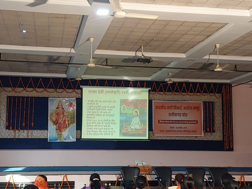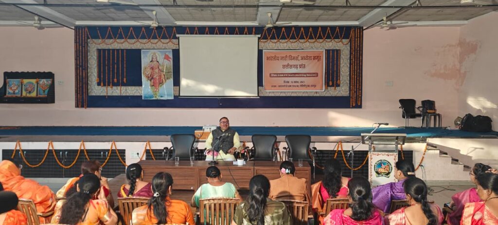 भारतीय नारी विमर्श, अध्येता समूह छत्तीसगढ़ प्रान्त का विचार मंथन सत्र रविवार को सरस्वती शिक्षण संस्थान रोहिणीपुरम में आयोजित हुआ। जबलपुर से आईं नारी विमर्श की क्षेत्रीय संयोजिका डॉ नूपुर निखिल देशकर ने सत्र के प्रारंभ में विषय समझाते हुए कहा कि नारी और विमर्श दो बिंदु हैं। भारत मे आज प्रबुद्ध नारियों के बीच इस विमर्श की आवश्यकता क्यों पड़ी? जहां स्त्रियां शोषित थीं, वहां उन्होंने आवाज़ उठाई। शक्ति ही शिव का आधार है। धर्म, अर्थ, काम और मोक्ष चारों ही में उसकी समान भूमिका है। स्वतंत्रता पूर्व नारी विमर्श ने विकृत भाव पैदा किया। औपनिवेशिक स्वरूप ने इसे बिगाड़ा। विदेशी महिला साहित्यकारों के साहित्य ने भारतीय महिलाओं पर प्रभाव डाला। 1837 में पहली बार नारी विमर्श शब्द आया।1970 के बाद भारत के विश्वविद्यालयों में पश्चिम के साहित्यकारो को पढ़ाया जाने लगा। परिणामस्वरूप पितृसत्ता, लैंगिक उत्पीड़न जैसे विषयों पर बहस करने लगे।वैश्वीकरण व बाज़ारीकरण ने महिलाओं के स्वरूप को बिगाड़ा। नारी को उपभोक्ता व उत्पाद बनाया गया।बॉलीवुड ने भी स्त्रियों की छवि को बदल दिया। नारी अधिकारों की याचक नहीं, कर्तव्यों की शक्ति है।