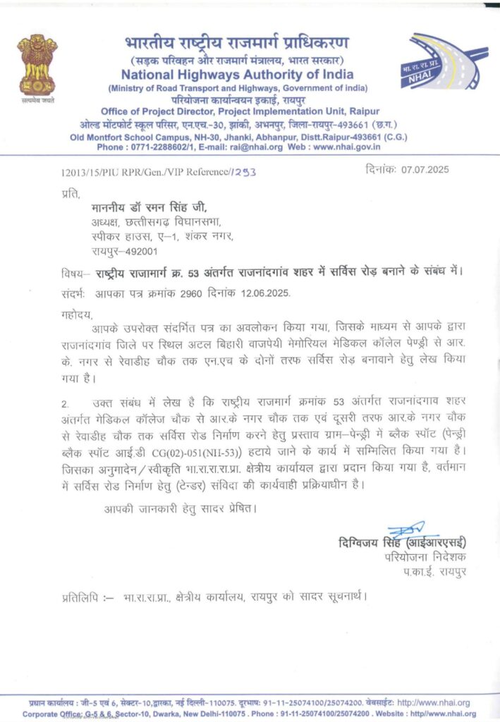 जिस पर प्रतिक्रिया देते हुए भारतीय राष्ट्रीय राजमार्ग प्राधिकरण के परियोजना निदेशक द्वारा पत्र के माध्यम से बताया गया है कि “राष्ट्रीय राजमार्ग क्रमांक 53 अंतर्गत राजनांदगांव में मेडिकल कॉलेज मोड़ से आर.के नगर चौक दोनों तरफ़ सर्विस लेन निर्माण का प्रस्ताव रायपुर भेजा गया है एवं इसका अनुमोदन भी प्रदान कर दिया गया है। जिसके उपरांत सर्विस रोड के निर्माण कार्य की (टेंडर) संविदा की कार्यवाही प्रक्रियाधीन है।