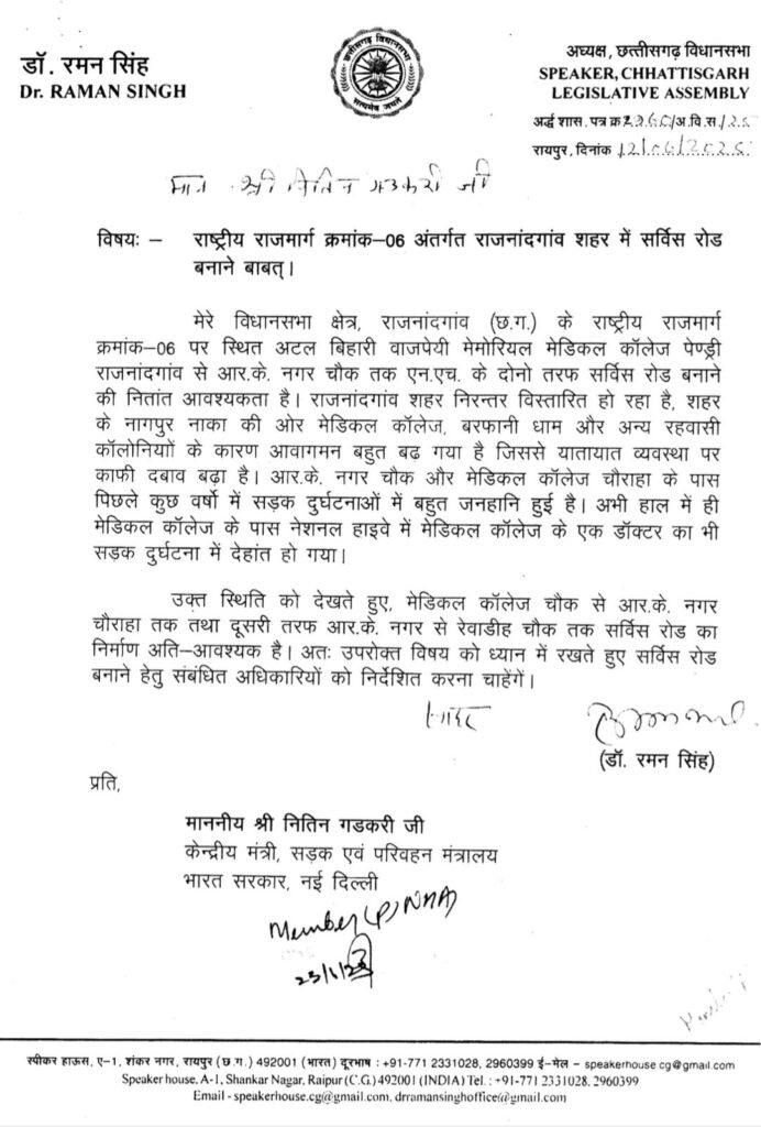 राजनांदगांव। राजनांदगांव में बढ़ते ट्रैफिक को ध्यान में रखकर परिवहन की सुविधाओं के विस्तारीकरण के लिए राष्ट्रीय राजमार्ग क्रमांक 53 (पूर्व में राष्ट्रीय राजमार्ग क्रमांक 6) पर स्थित अटल बिहारी वाजपई मेमोरियल मेडिकल कॉलेज पेंड्री से आरके नगर चौक तक दोनों तरफ सर्विस रोड बनाने की आवश्यकता पर गंभीरता से विचारकर छत्तीसगढ़ विधानसभा अध्यक्ष और राजनांदगांव विधायक डॉ रमन सिंह ने केंद्रीय मंत्री सड़क एवं परिवहन मंत्रालय, नितिन गडकरी को 12 जून 2025 को पत्र लिखकर अवगत करवाया था। इसके साथ ही विधानसभा अध्यक्ष और राजनांदगांव विधायक डॉ रमन सिंह ने इस पत्र में यह आग्रह भी किया था कि राजनांदगांव में एनएच 53 पर बढ़े ट्रैफिक की स्थिति को देखते हुए मेडिकल कॉलेज चौक से आर.के. नगर चौराहा तक दोनों तरफ सर्विस रोड का निर्माण किया जाए। इसके साथ ही राजनांदगांव सांसद संतोष पाण्डे ने भी इस मार्ग पर सर्विस लेन निर्माण के लिए 14 जून 2025 को पत्र लिखकर केंद्रीय मंत्री से आग्रह किया था।