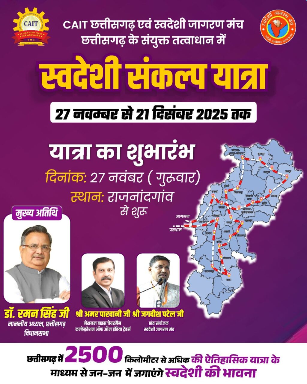 राजनांदगांव। कन्फेडरेशन ऑफ ऑल इंडिया ट्रेडर्स (CAIT) एवं स्वदेशी जागरण मंच के संयुक्त तत्वावधान में पूरे देश में संचालित स्वदेशी संकल्प यात्रा 27 नवम्बर 2025 को छत्तीसगढ़ में प्रवेश करेगी। स्वदेशी, आत्मनिर्भर भारत एवं वोकल फॉर लोकल के संदेश को जन-जन तक पहुँचाने के उद्देश्य से निकली यह यात्रा प्रदेश में व्यापारी समुदाय और स्थानीय उद्योगों के लिए ऊर्जा एवं उत्साह का नया संचार करेगी।