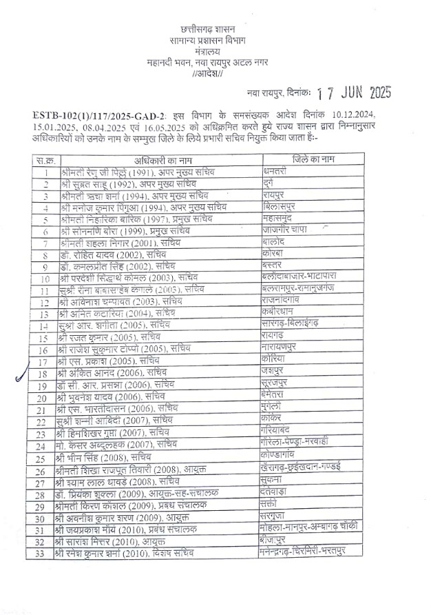 राज्य सरकार ने IAS अफसरों को प्रभारी सचिव किया नियुक्त, ऋचा शर्मा को रायपुर, मनोज पिंगुआ को बिलासपुर… देखिये 33 जिलों के प्रभारी सचिव…