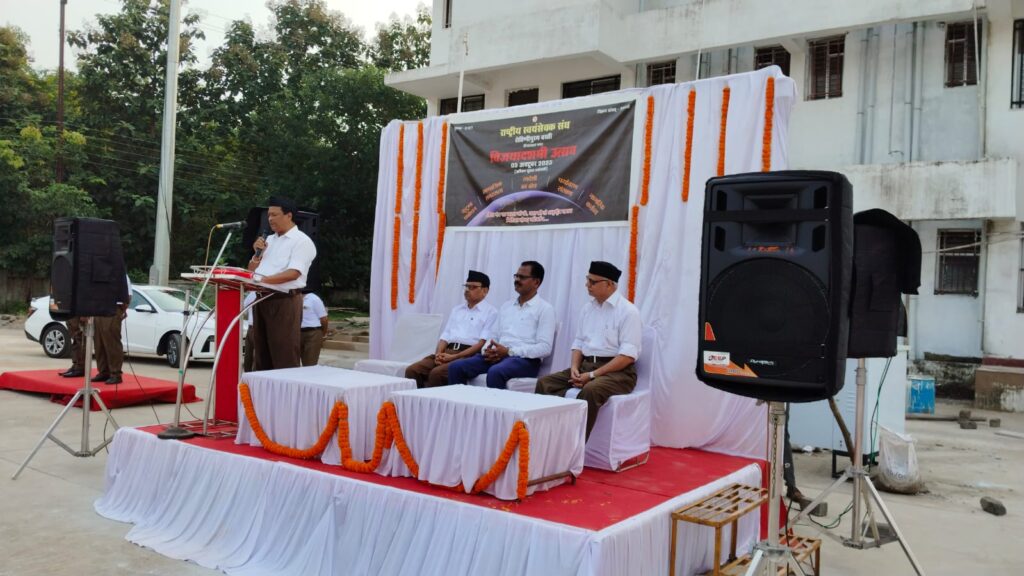 विवेकानंद नगर माना बस्ती में देर शाम को हुए कार्यक्रम में बतौर मुख्य वक्ता रहे भाजपा संगठन मंत्री पवन साय ने कहा कि संघ कार्य ने शताब्दी वर्ष पूर्ण किया है। 100 वर्ष के कठिन डगर में लाखों करोड़ों स्वयंसेवको का त्याग, तपस्या, बलिदान रहा हैं। उन्होंने कहा कि इसी त्याग से निकले हजारों कार्यकर्ताओं ने मिलकर समाज हित में विद्या भारती, विश्व हिन्दू परिषद, वनवासी कल्याण आश्रम जैसे कई दर्जन संगठन खडा किया। ये सभी संगठन समाज में बदलाव के वाहक हैं। यहाँ मुख्य अतिथि के रूप में शदाणी दरबार पीठाधिश्वर युधिष्ठिर लाल जी मौजूद थें।